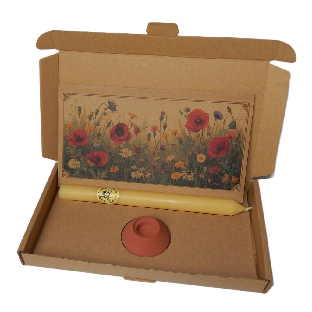 Kartonik Ciepła – świeca pszczela, świecznik i kartka Maki na łące