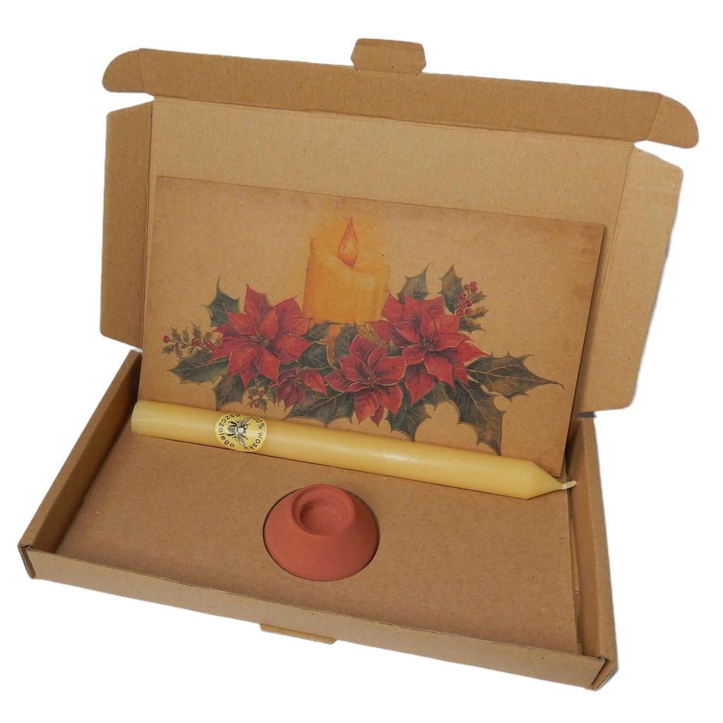 Kartonik Ciepła – świeca pszczela, świecznik i kartka Świeca i stroik