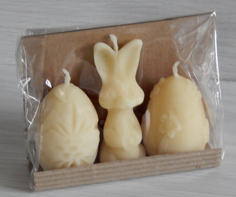 Ozdobnie opakowane trzy świeczki z wosku pszczelego: - małe jajko - pisanka w kwiatki - małe jajko - pisanka z gwiazdkami - zajączek   Wysokość: 5,5 cm i 7 cm Zalecenia: włożyć do szerszego