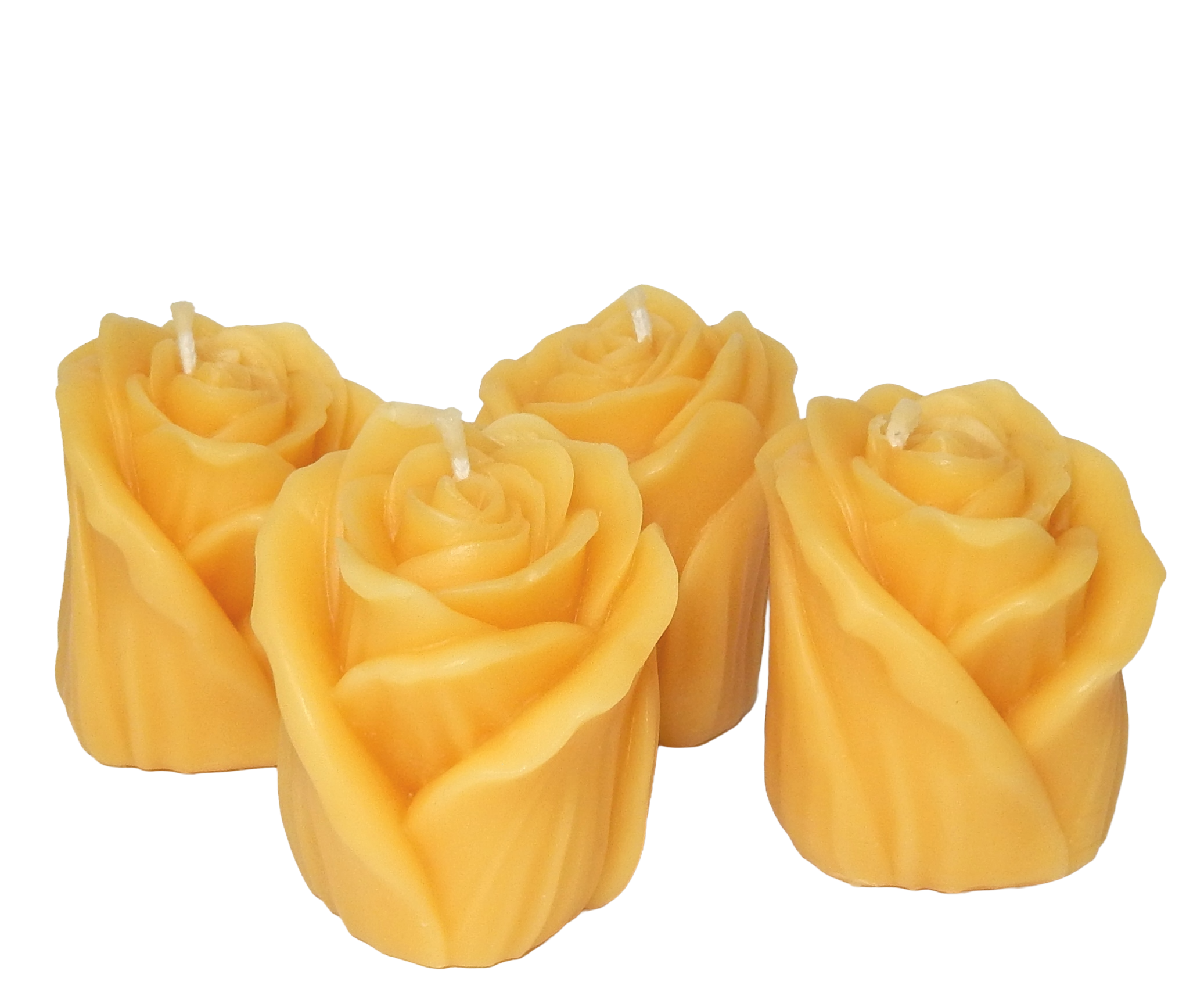 Elegancki zestaw 4 ręcznie robionych świec z czystego wosku pszczelego w kształcie róż. Naturalny zapach miodu, 16h palenia i unikalny design. Sprawdź!